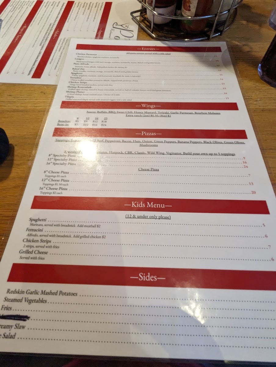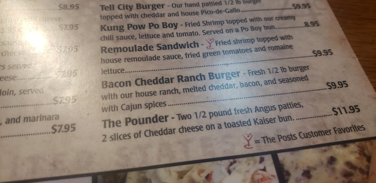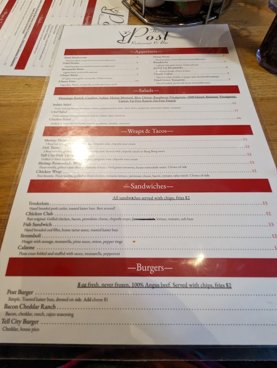From a reviewer’s perspective, the menu at The Post offers a well-rounded and comforting selection that reflects the spirit of an all-day neighborhood restaurant, making it easy for diners to find something satisfying at any time of day. The sandwich lineup is hearty and familiar, with options like the Fish Sandwich, Tell City Burger, Tenderloin Calzone, and Bacon Cheddar Ranch Burger, all of which cater to classic American tastes. For those craving something shareable or snack-worthy, the wings section featuring Bone-In Wings and Boneless Wings is a dependable choice. The menu also balances indulgence with lighter or more versatile items through wraps and tacos such as Fish Tacos, Shrimp Tacos, Tell City Fish Tacos, Shrimp Remoulade Wrap, and Chicken Wrap, which add variety and seafood-forward flavors. Salad lovers are not overlooked, with straightforward but appealing options including the Chef Salad, Chicken Salad, and Italian Salad. When it comes to entrées, comforting dishes like Lasagna, Fried Shrimp Platter, Shrimp Remoulade Pasta Alfredo, and Chicken Strips & Fries help anchor the menu with filling, classic plates. Complementing these are satisfying sides such as Steamed Veggies, Redskin Garlic Mashed Potatoes, Creamy Slaw, Side Salad, and Fries. Pizza fans can choose from multiple sizes and topping options, including the 12" Cheese Pizza, 16" Cheese Pizza - 2 Topping, Hanyock, 8" Cheese Pizza - 1 Topping, and 8" Cheese Pizza - 2 Toppings, making it easy to dine solo or with a group. Starters like Pepper Jack Cubes, Breadsticks, Mozzarella Sticks, Cheddar Cubes, and Onion Petals set the tone for a casual, share-friendly experience, while the kids’ menu-featuring Fettuccine, Grilled Cheese, Spaghetti, and Chicken Strips-rounds out the offering for families. Overall, The Post’s menu feels thoughtfully assembled, combining familiar comfort foods with enough variety to appeal to a wide range of diners, making it a solid and reliable choice in Tell City.